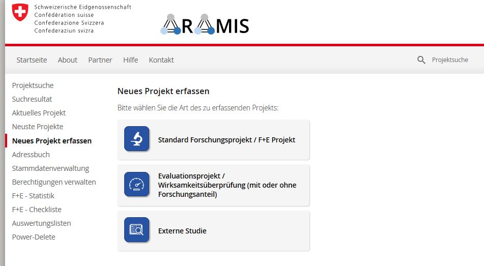 In ARAMIS können folgende Arten von Projekten einzugeben: "Standard Forschungsprojekt", "Evaluationsprojekt" oder "Externe Studie". Je nach Projekttyp sind unterschiedliche Daten in ARAMIS zu erfassen. Falls sie unsicher sind welche Art von Projekt für ihr Vorhaben zutreffend ist, finden sie hier weitere Informationen .