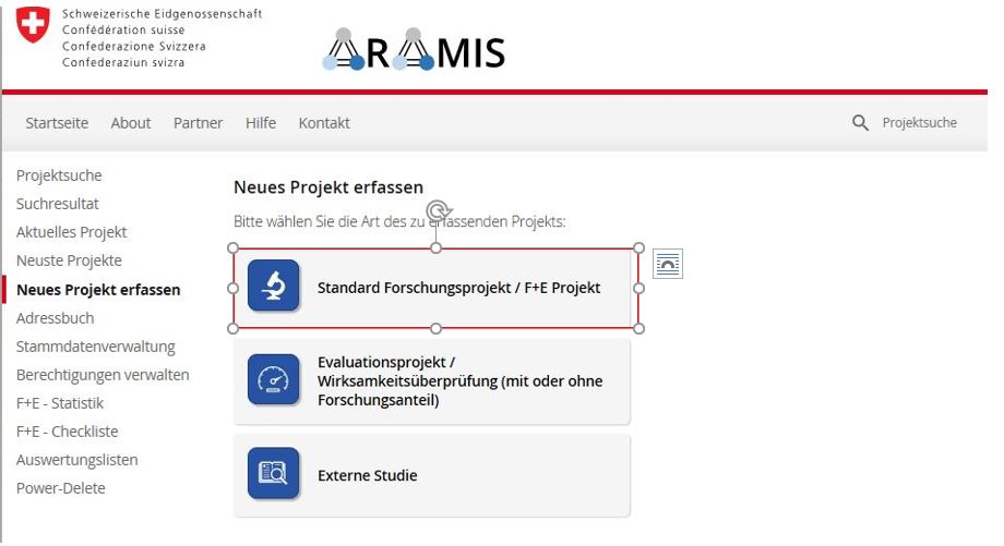 Um ein neues Projekt zu erfassen klicken sie in der linken Menuleiste auf "Neues Projekt erfassen" und wählen anschliessend "Standard Forschungsprojekt / F+E Projekt"
