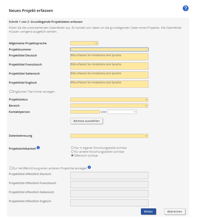 Füllen Sie im Eingabeformular die unten beschriebenen Felder aus und stellen Sie die Projektsichtbarkeit ein. Im ersten Eingabeformular müssen zwingend alle Datenfelder ausgefüllt werden.
