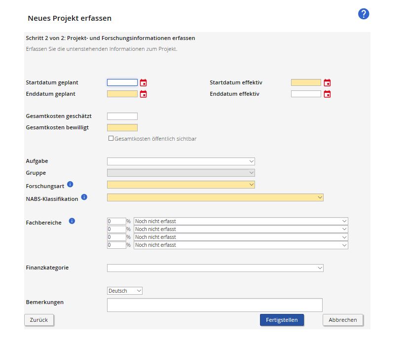 Erfassen Sie die untenstehenden Angaben zum Projekt und speichern Sie dieses durch "Fertigstellen". Die Daten können auch ohne die Angabe sämtlicher Werte gespeichert werden. Diejenigen Felder welche zwingend ausgefüllt werden müssen sind mittels gelbem Hintergrund geknnzeichnet. Durch Klicken auf "Projekt anzeigen" gelangen Sie zum erfassten Projekt.
