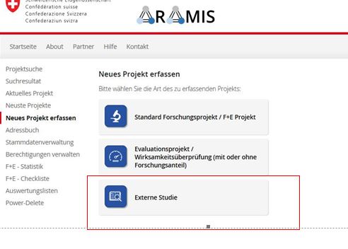 Tipp: Folgen Sie diesen Schritten nur dann, falls Sie eine neue Externe Studie in ARAMIS erfassen wollen. Um ein bereits zu einem früheren Zeitpunkt erfasstes Projekt zu ergänzen oder abzuschliessen, folgen Sie den Anleitungen "Bearbeiten und kontrollieren bereits erfasster Studien" weiter hinten in diesem Leitfaden.